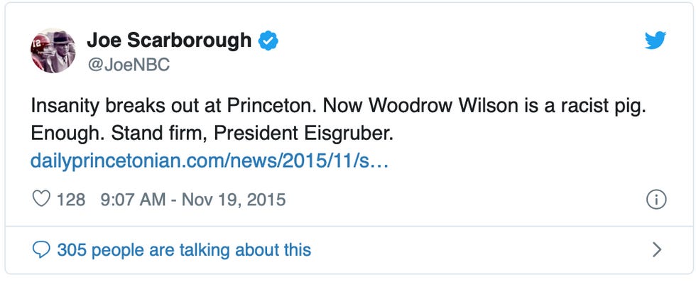 So, regardless of whatever he might have contributed to Princeton as its 13th president, Wilson was in fact a “racist pig" who is not worth honoring. Princeton's decision apparently devastated Texas senator and Princeton alum Ted Cruz, whose name will only ever appear on the inside of toilet bowls. Cruz tweeted the shocking news that Wilson was a Democrat.