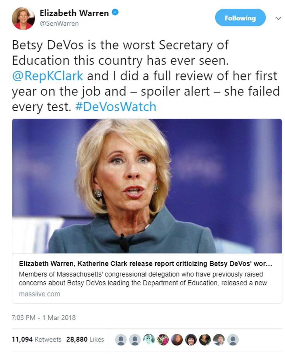 In statements to the media, Clark gave DeVos a grade of "F" for "failing to protect our promise to America's students," and Warren repeated her insistence that DeVos is simply the worst Education secretary ever: