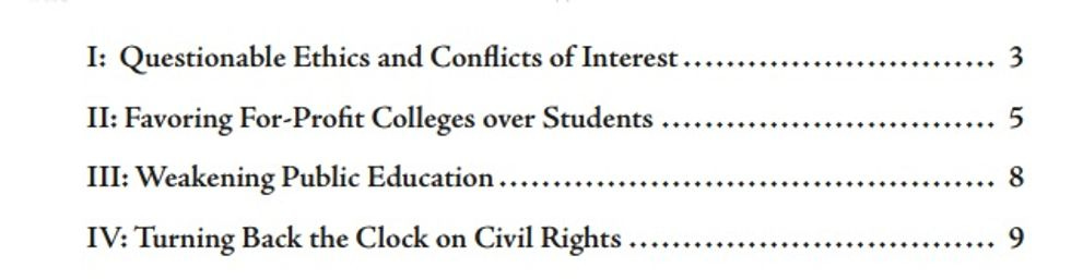 The report is on more solid ground when detailing the staff DeVos has brought to the Education Department: Three of DeVos's top staffers come straight out of the for-profit college industry; two of them were executives with colleges that were sued for scamming their students. Gee, bet they'll do a terrific job of setting education policy.