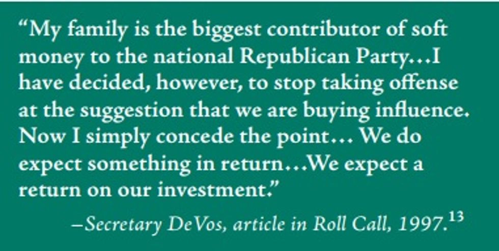 One might quibble, perhaps, that the report elides what DeVos said is the "return on investment" she sought ("We expect to foster a conservative governing philosophy consisting of limited government and respect for traditional American virtues") because she was talking about policy priorities, not remuneration, but those policy priorities are radical in themselves.