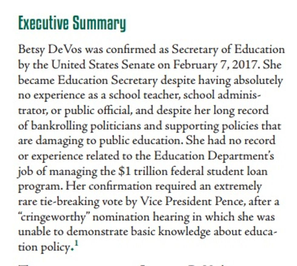 Nobody's going to accuse this report of being dry and bureaucratic, but unlike the work of certain EPA press spokespeople named Liz Bowman, Warren and Clark back up the tough talk with details, carefully footnoted and supported by evidence. Yes, of course it's got an agenda, but it makes a persuasive case. Which, really, isn't all that difficult when you're writing about someone whose confirmation hearings so clearly demonstrated she had very little familiarity with federal education policy apart from a sincere desire to dismantle it (the report's section on DeVos's confirmation alone leaves us whomperjawed that anyone so devoid of experience could be confirmed).