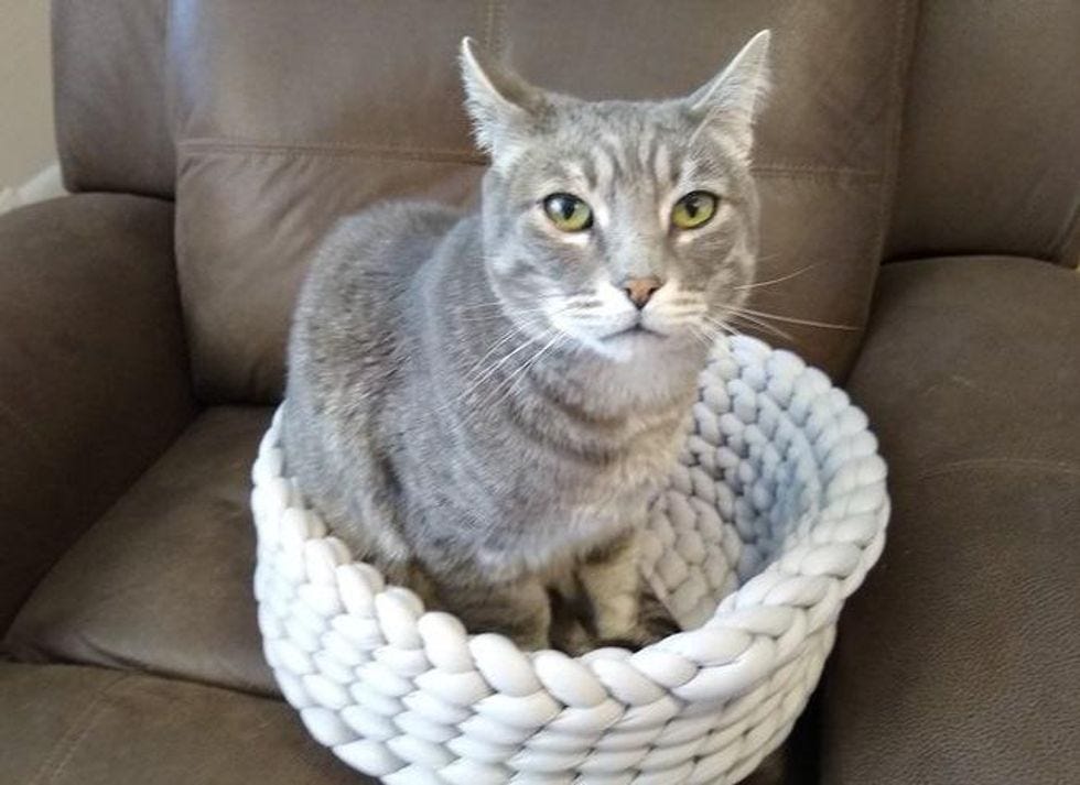 Here, have a Thornton photo. He's such a doofus. Won't sleep in the little basket bed when it's on the floor, but if it's up on the recliner, where I put it to get it out of the way of the Roomba, he'll happily curl up for a nap there. Hence, I don't usually bother putting the bed back on the floor until I want to use the recliner.