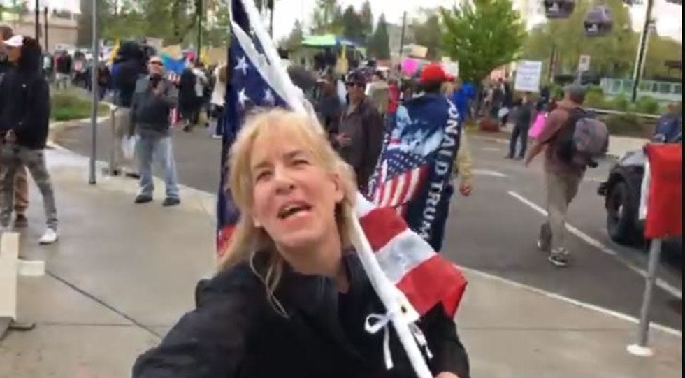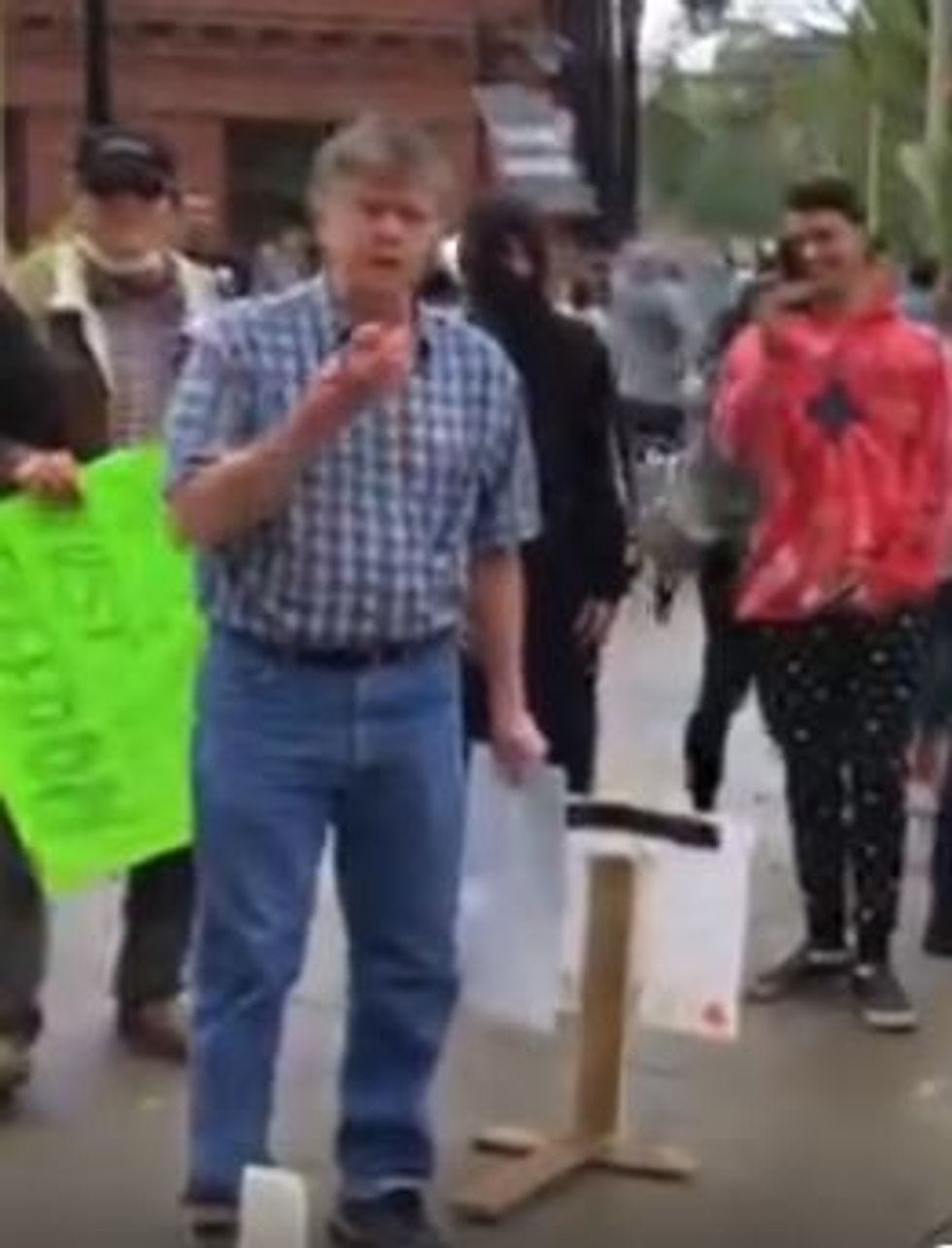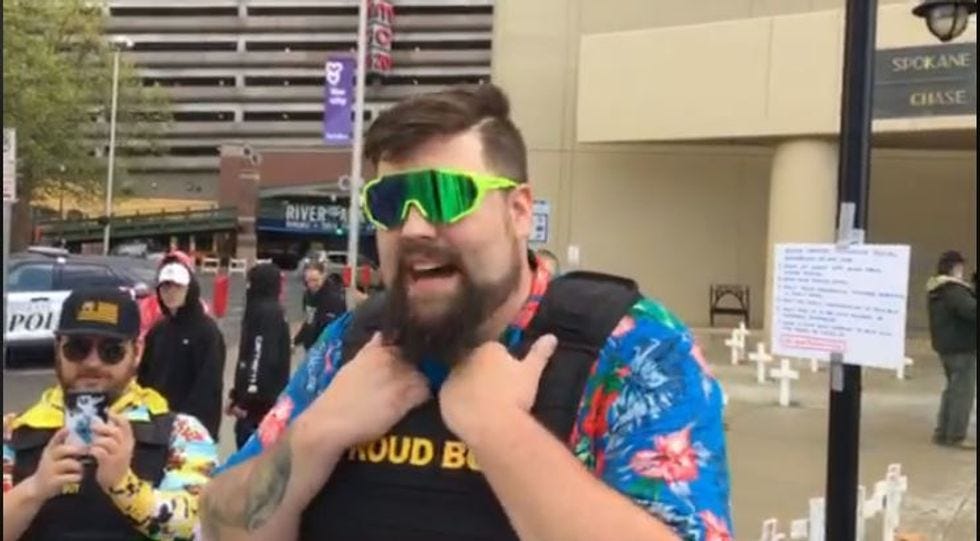 The memorial had been put together by activist Tom Robinson, who runs the Stronger Together Spokane Facebook page. Robinson also attended the protest as a counterprotester, where he planned to simply stand with his memorial and not bother anybody. This did not work out as planned, because these people are the biggest assholes on earth. A video posted to the group's Facebook page show the protesters harassing Robinson, screaming at him to take off his mask and otherwise acting like the school bullies in a John Hughes movie.