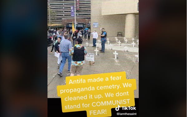 Soon after, Seattle area Proud Boys Zac Staggs, Josh Hanks, and Daniel "Milkshake" Lyons Scott posted a video to TikTok in which they actually bragged about tearing the memorial down, writing "Antifa made a fear propaganda cemetery. We cleaned it up. We don't stand for COMMUNIST FEAR" as a caption on a picture of it. The image then switches to a picture of the crosses in a pile on the ground, with a hand doing the "OK" symbol now associated with "White Power" over it. Because of course.