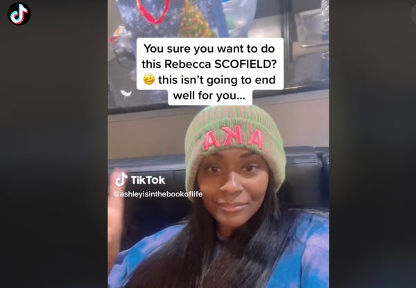 One person, however, is very sure she knows who did it. Ashley Guillard doesn't know any of the victims and she lives in Texas, but she swears she knows for a fact that the murderer is none other than the university's history department chair, Rebecca Scofield. How does she know this? Because her magic tarot cards and psychic powers told her so.