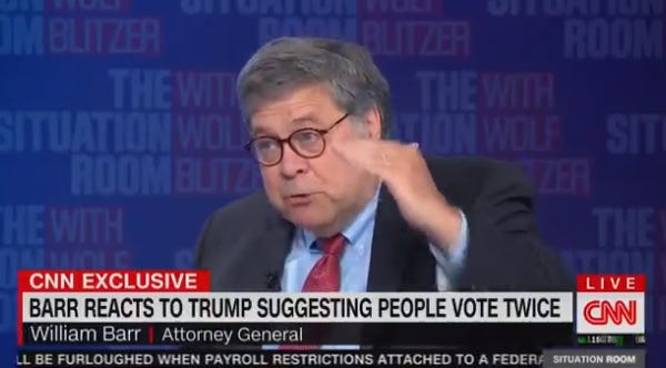 Here is a longer clip of Barr defending Trump (committing a crime by) telling his voters to commit voting fraud. "I don't know what the law in that particular state says," Barr claimed, feigning ignorance about whether voting twice is OK if the fascist president says it's OK. How could he know? He is only the attorney general, after all.