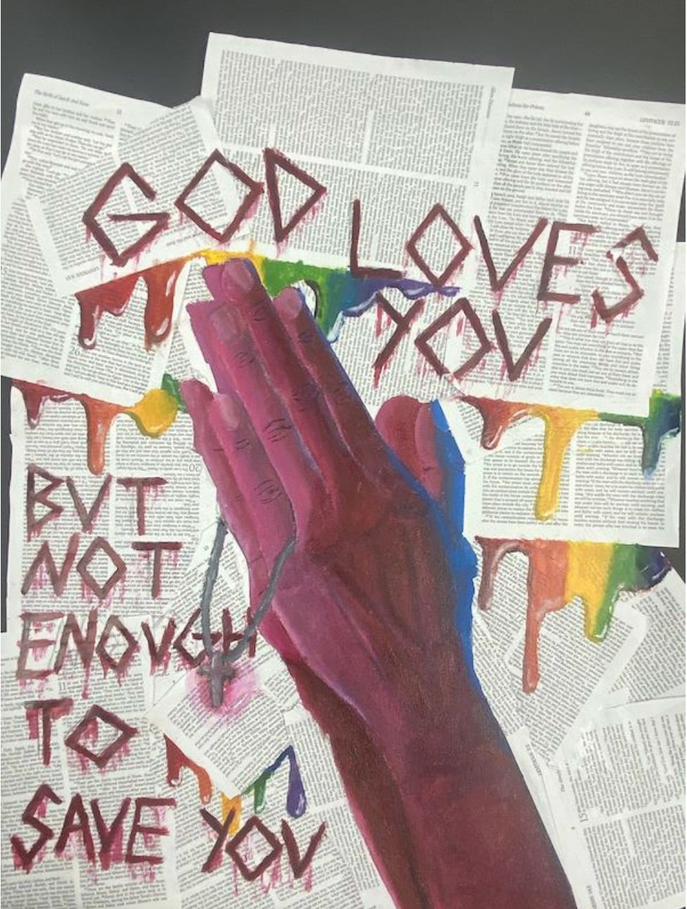 The painting itself is pretty freaking awesome. It depicts praying hands holding a rosary over a patchwork of pages from the Bible, dripping with rainbow “blood,” with the words “GOD LOVES YOU BUT NOT ENOUGH TO SAVE YOU” emblazoned across. (You can buy a print here if you like!)