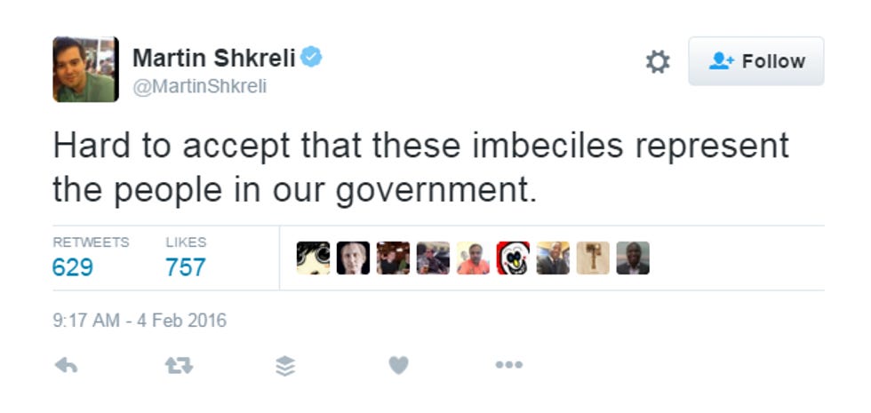 Look, Martin. We know you think you're some sort of cool supervillain -- almost Trump-esque in your bluster and appeal. SPOILER ALERT: You're not. Literally no one likes you. REPUBLICANS hate you, and they typically love people who screw over the poor, particularly the poor with AIDS and pregnant ladies. You're a preening little psychopath with a face that is almost as punchable as that of Ted Cruz. Pretty much the entire world wants to take you down a peg, and it's only a matter of time. We can't wait.