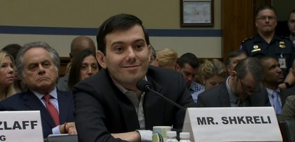 So you might have noticed that professional douchebag/hip-hop enthusiast Martin Shkreli was all over your Internet this morning being even more of a preening little twerp than normal. Why was this? Because there was a Congressional hearing that surprisingly was NOT about Benghazi, and Shkreli was the smirking star of the show. (The careful reader will note that this hearing is not about Martin's other bad habit, which is running a massive shell game and robbing Peter to pay Paul in some complicated investment schemes that turned out -- whoops! -- to actually be crimes. )