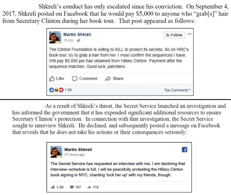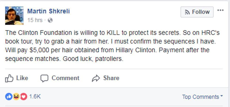 Shkreli wanted one of Clinton's hairs with a follicle attached so he could compare it to a DNA sample he claimed to have? Who the hell knows what that maniac is talking about.
