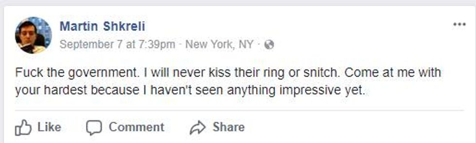 Although he's banned for life from Twitter for harassing Lauren Duca , Shkreli spends much of his free time argle bargling on Facebook Live for his many followers. Of late he has been barfing out some shit about Hillary Clinton plotting against him? We are not entirely clear, since he deleted much of the original post and we'll just Hulk Smash the 'puter if we have to do an extensive image search of that pustulent weenus's ugly mug.