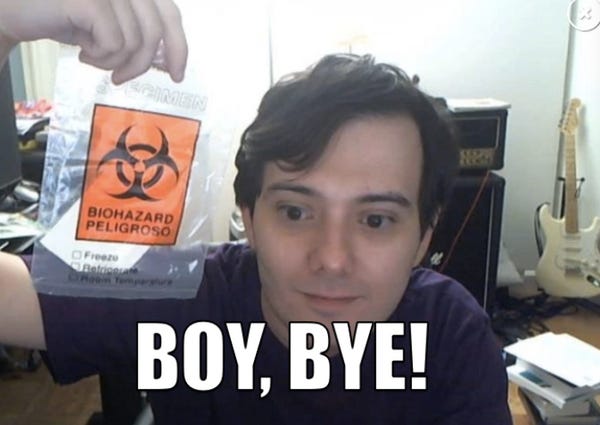 Just kidding! That dickweasel Martin Shkreli deserves everything he gets AND MORE! Not just for hiking the price on lifesaving AIDS drugs , but for being the escaped id of rapey online harassers everywhere. Also, too, there is the Ponzi scheming. After his "But I Put The Money Back Eventually" defense failed to impress a jury last month, Shkreli was convicted of securities fraud . The judge released him into the wild on $5 million bail to await sentencing next year.