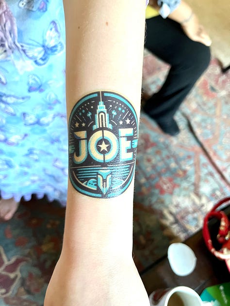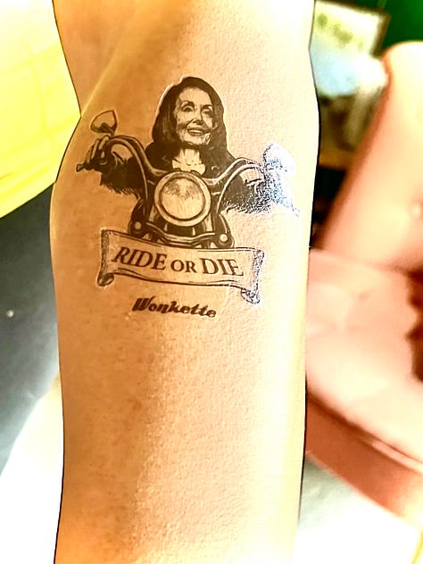 Yes, we’ve got temporary tattoos, with three kinds of Joe, your gorgeous BIDEN HARRIS NEW DAY, a Nancy, a Wonkette baby kitten, and an RBG!