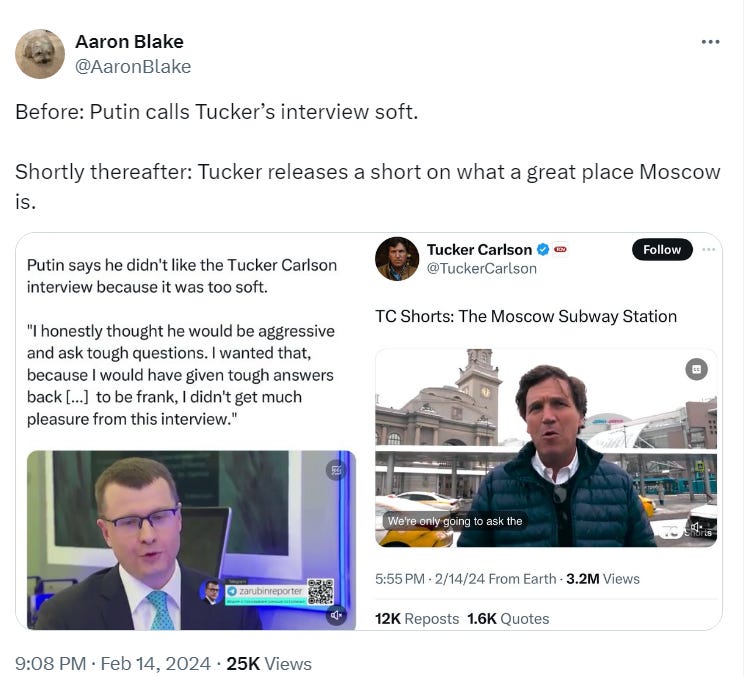 Putin says he didn't like the Tucker Carlson interview because it was too soft. "I honestly thought he would be aggressive and ask tough questions. I wanted that, because I would have given tough answers back [...] to be frank, I didn't get much pleasure from this interview."