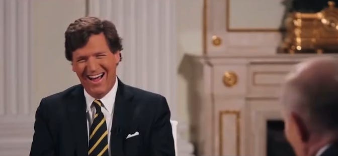 In response, Tucker broke out into the high-pitched, try-hard giggle we imagine he’s been leaning on during moments such as these for many, many years. It lasted 10 uncomfortable seconds.