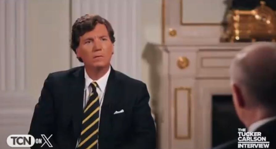 And there was this one, where, after Putin had yapped on and on about time in 1278 AD when Olga the sensual Russian she-bear of the north made duel with Nadiya, official bear slut of Kyiv, he made fun of Tucker for probably not being able to handle his “long speeches” because after all, Tucker is just an entertainer, right?
