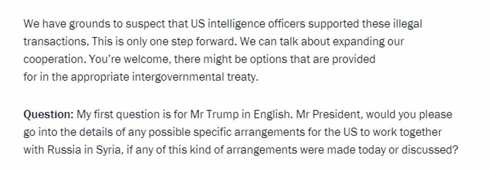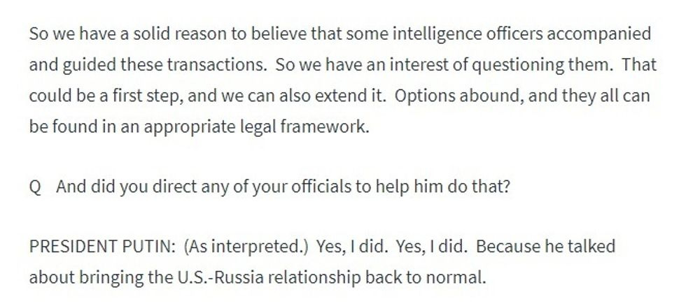 All very clear and not at all colludy, because who wouldn't want better relations between our two great nations? Ah, but here's a screenshot of the White House's transcript, still not corrected as of this morning. It goes straight from the end of Putin's suggestion that it might be fun if the US would please turn over British citizen Bill Browder for questioning, to the second half of Mason's question. The way it shows up here, it looks like Putin is totally saying "Yup, I certainly helped him do that," whoever "him" and "that" might be: