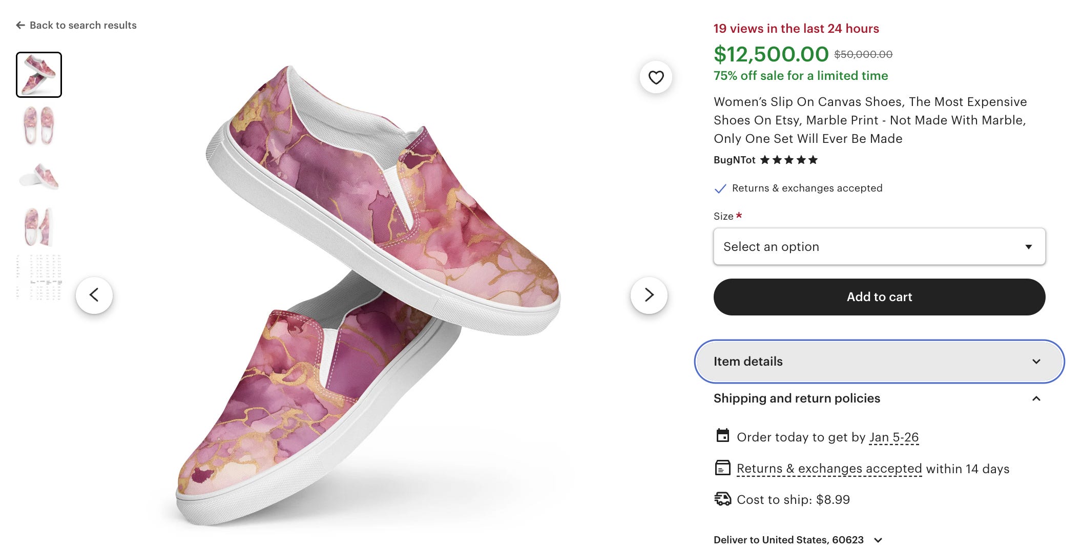There are a lot of obviously ridiculously overpriced things on Etsy — some done as a placeholder for an item that is sold out or coming soon, some as NFTs and some as obvious jokes, like these $12,500 slip on shoes, described as “Women’s Slip On Canvas Shoes, The Most Expensive Shoes On Etsy, Marble Print - Not Made With Marble, Only One Set Will Ever Be Made”