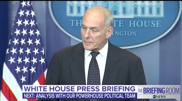 The featured speech on Kelly's page is his slime-time address from October 19, 2017, the sole point of which was to defend Trump. This usually involves lying, and there was plenty to spare. Trump was callous and gross to a gold star widow, but the former general decided to blame Florida House Rep. Frederica Wilson for everything. He laments in his speech that women are no longer "sacred" while crudely slandering Wilson, who is a woman. He claimed that Wilson, whom he called an"empty barrel," bragged about securing federal funds to build an FBI field office in South Florida. She did no such thing, as a video that later surfaced proved. He still refused to apologize to the congresswoman because he's consistently a jerkto women. This demonstrated the same unwillingness to "compromise" that Kelly stupidly claimed was the primary cause of the Civil War.