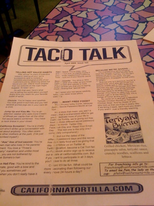 "Psst..WANT FREE FOOD?": CalTort wants to "network" by convincing You to "follow" its Twitter and Facebook and the other one, MySpace. (Apparently, CalTort is currently enrolled in a few New Media Internet Social Media in the Age of the Digital Internet seminars at the Columbia Journalism School.) Anyway, so if you do CT this small favor, the restaurant will send yousecret passwords that will eventually result in Your receiving of food, free of charge. [ Taco Talk , Issue 165 ]
