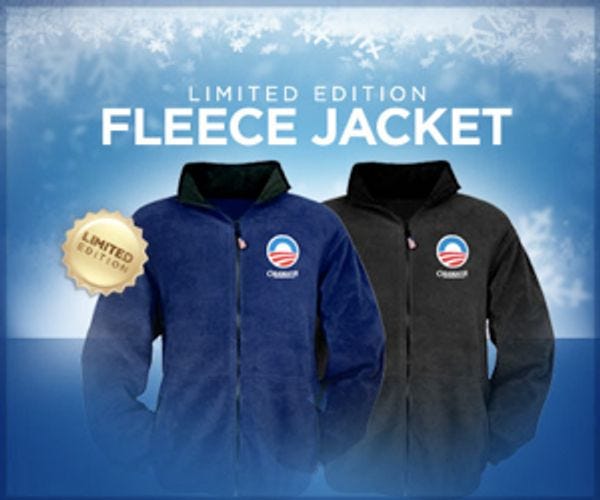 The silly DNC spent all of its cash on loser Jim Martin's 800 losses in Georgia this year, so what do they do, right, they go to Obama and ask for a damn check, and then he e-mails us to hawk some more junk. "Obama for America" writes, "This holiday season, celebrate the historic accomplishment of our movement for change. Treat yourself or a loved one to a limited edition Obama fleece jacket." It's really the only appropriate celebration for such an historic accomplishment. They are $50, and if you do not buy one then you hate black people. [ Barack Obama ]