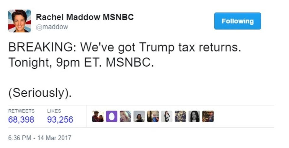 RACHEL MADDOW BROKE TWITTER ABOUT TRUMP'S TAXES, LET'S WATCH RACHEL MADDOW TOGETHER