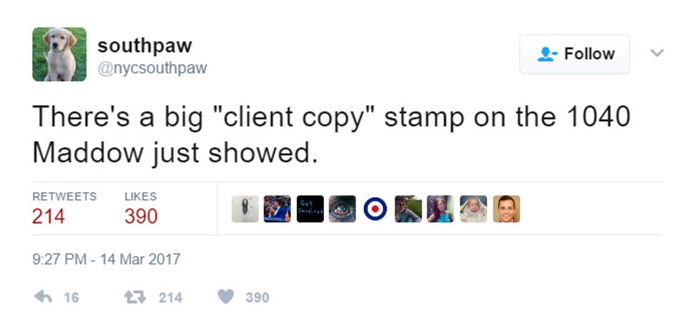 Then Maddow tweeted that what she has is something from Trump's 2005 1040 form. She says this was handed to a reporter (David Cay Johnston), and she does not know why. Also, that could be important to the story!