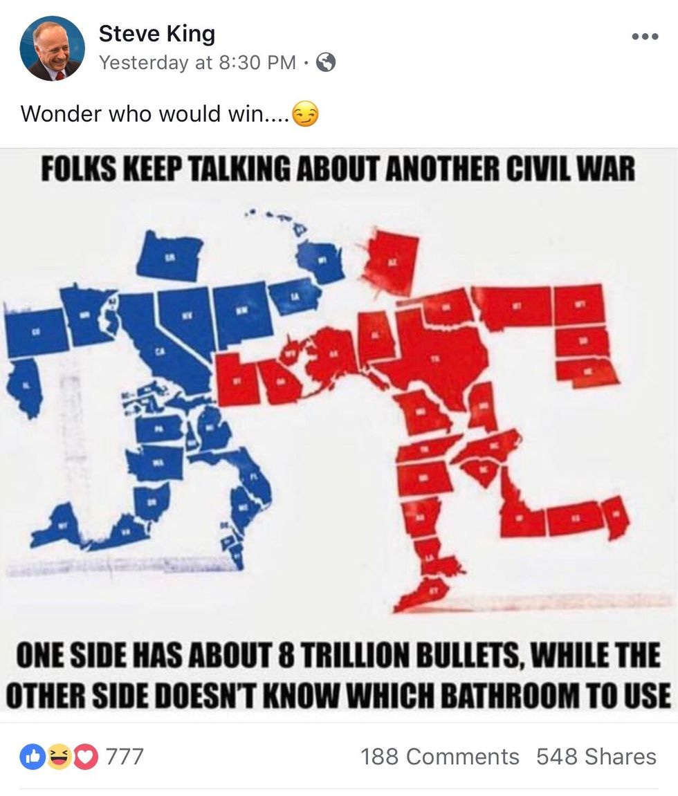 Oh, you mean THIS Steve King? The one that the GOP took 16 years to condemn his racism? The one still being a bigot now fantasizing about a violent a civil war?