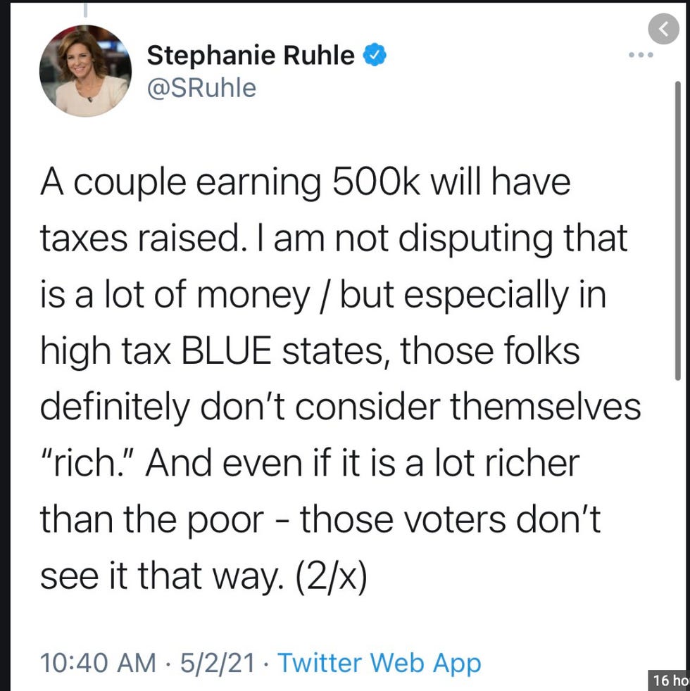 A couple earning 500K will have taxes raised. I am not disputing that is a lot of money/ but especially in high tax BLUE states, those folks definitely don't consider themselves “rich." And even if it is a lot richer than the poor — those voters don't see it that way.