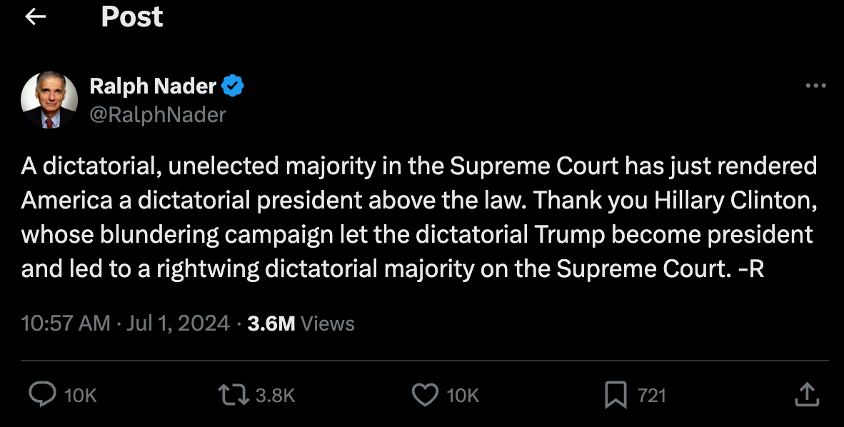 In one of those moments that was greeted by a resounding chorus of “Oh go fuck yourself back to whatever rock under which you were currently decomposing,” Ralph Nader decided to weigh in on this week’s Supreme Court decision giving Donald Trump license to grab Fifth Avenue by the pussy and shoot it, as long as Trump says it’s an Official Act.