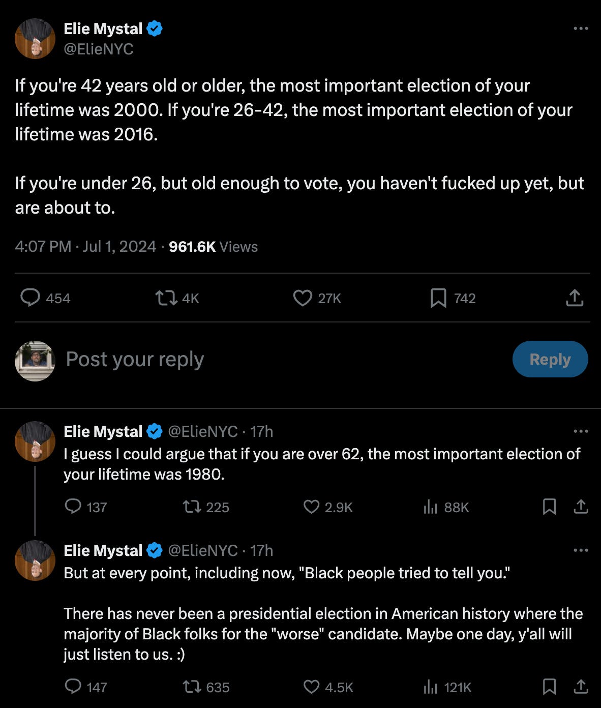 “If you're 42 years old or older, the most important election of your lifetime was 2000. If you're 26-42, the most important election of your lifetime was 2016. If you're under 26, but old enough to vote, you haven't fucked up yet, but are about to.”