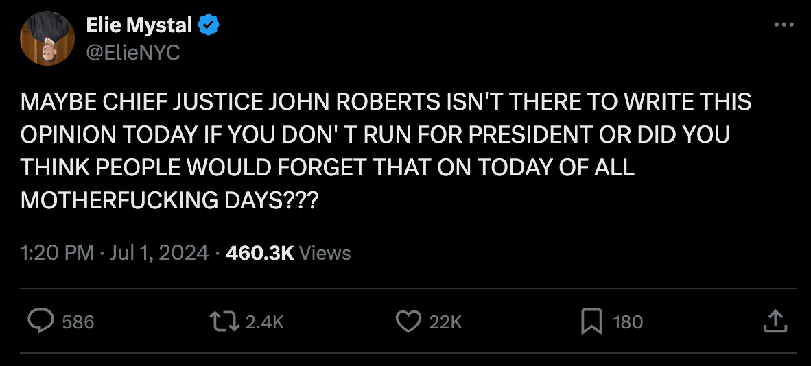 “MAYBE CHIEF JUSTICE JOHN ROBERTS ISN'T THERE TO WRITE THIS OPINION TODAY IF YOU DON' T RUN FOR PRESIDENT OR DID YOU THINK PEOPLE WOULD FORGET THAT ON TODAY OF ALL MOTHERFUCKING DAYS???”
