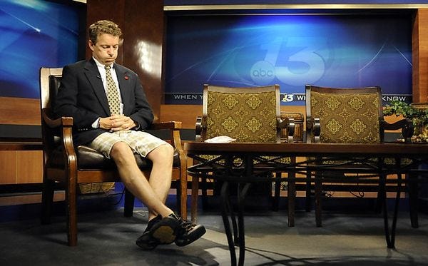 Ah, but then Charlie Pierce's five-minute rule kicked in: Rand is able to make sense for about five minutes, impressing you with his insight, and then he'll inevitably "say something so far off the rails that you will find yourself looking at him as though he has sprouted a reptilian head out of his sternum."