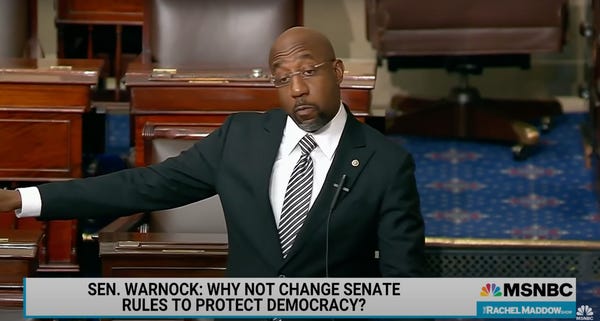 Warnock’s speech was damn good. He directly called out filibuster cheerleaders Manchin and Sinema (if not by name) and addressed their opposition to passing voting rights legislation without “bipartisan” support. Warnock isn’t a pessimistic man by nature but he's alive and conscious, so he understands that Republicans have “no intention” of supporting even the most moderate Stop Republicans From Cheating bill.