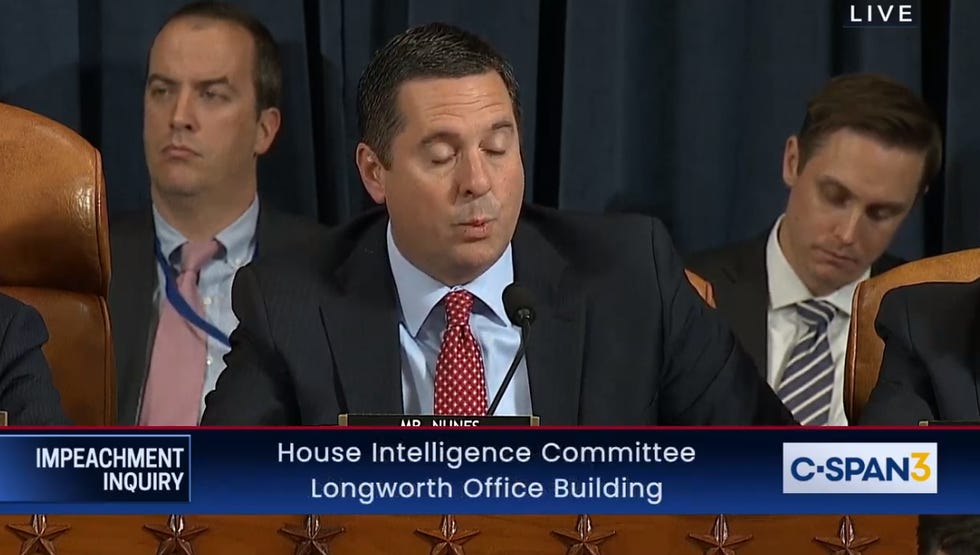 10: 20:Oh good, Devin Nunes gets to make an opening statement. Starts by saying LOL Dimmocrats thought Trump was a Russian agent! (He pretty much is. And this Ukraine story is related to that. )