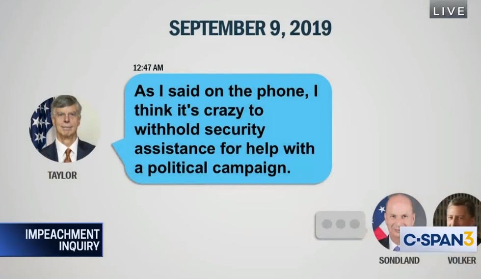 11: 44:Goldman shows text Taylor sent on September 9, where he says it would be "crazy" to withhold aid in order to extort Ukraine into doing investigations to help "a political campaign." Taylor clarifies that what Trump wanted was investigations into "the two Bidens."