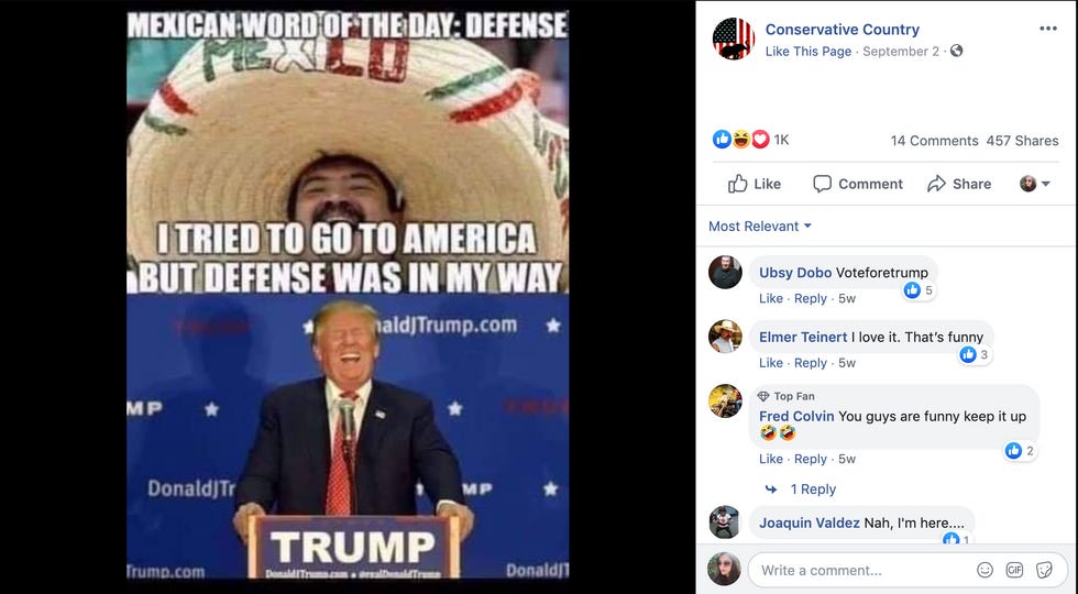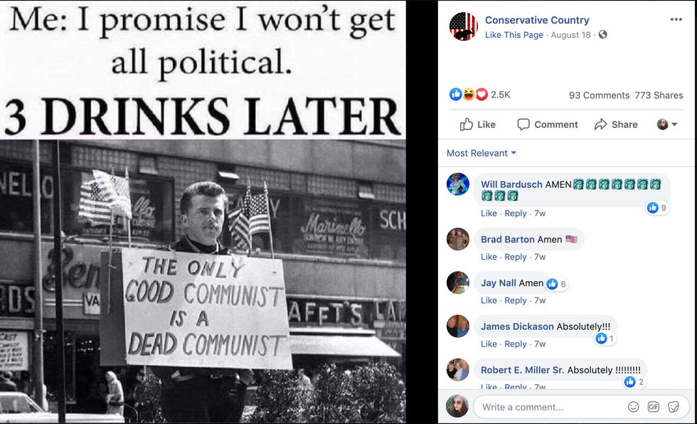 They've also, since 2016, secretly run a completely batshit Facebook page called "Conservative Country" that aggregates a whole bunch of violent, racist, Islamaphobic and just plain stupid far-right memes and articles, of the variety you might have seen from the weird relatives you don't talk to anymore before you blocked them all on social media. Prior to simply being a Facebook page full of memes about "My bacon can beat up your avocado" and "stupid things Alexandria Ocasio-Cortez never actually said," it was the official page of a now-defunct right-wing news website established in 2014, ConservativeCountry.net.