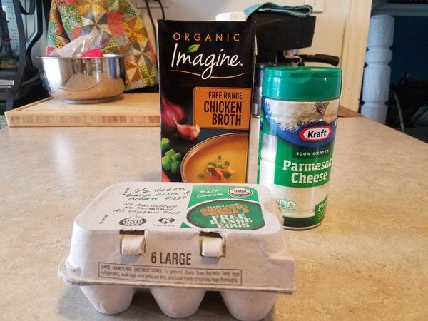 So, you're gonna crack the eggs, put your seasonings and cheese in and whisk it all up. Put it aside. Then heat up the chicken broth on the stove for a bit. Then, while it's simmering, gently pour your egg mixture in and stir until the eggs look cooked, and then you're done. Ta-da!