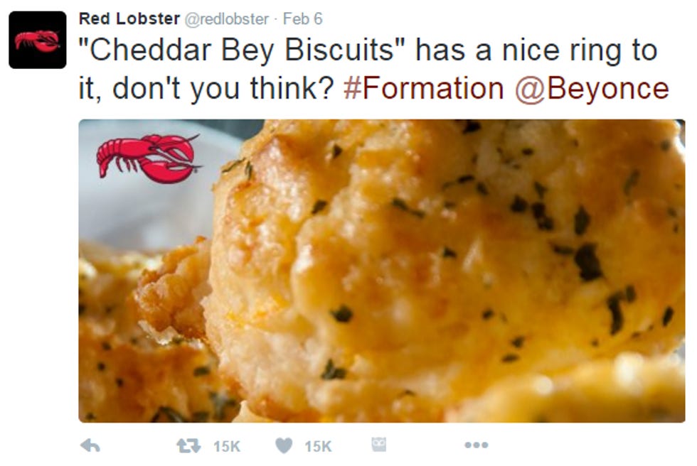 And because it got mentioned in the Beyoncé song -- "When he fuck me good I take his ass to Red Lobster" -- the restaurant chain is claiming it got a 33 percent sales spike on Super Bowl Sunday, compared to one year ago: