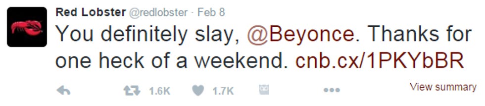 [contextly_sidebar id="ZcMQaI2bNPy7bubZgYdpl6RIbflfwwsd"]Red Lobster is having a very giggity week right now, what with the shoutout it just got from Queen Beyoncé Who Slays, in her stunning new single "Formation," which she released as a surprise on Saturday, the way she likes to do. If you live in the France or something and do not pay attention to real football, you may be unaware that on Sunday Beyoncé performed part of the song during the Super Bowl halftime show, and of course it caused MANY CONTROVERSIES, stemming from how Bey is black and she dared to tell a story about Black America from a black perspective and wingnuts don't even know what they're going to tell the children now.