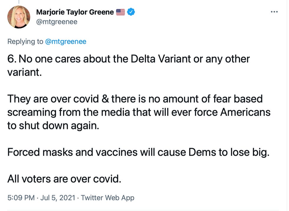 But we're in a Catch Twenty-Stupid: States with low vaccination rates are also the least likely to wear masks or tolerate others who do. Rep. Marjorie Taylor Greene tweeted a mini-manifesto Tuesday where she shared the same old lies about the 2020 election and smeared Democrats as inherently un-American. However, she insisted that all the “regular Americans" she speaks with daily are “over covid."