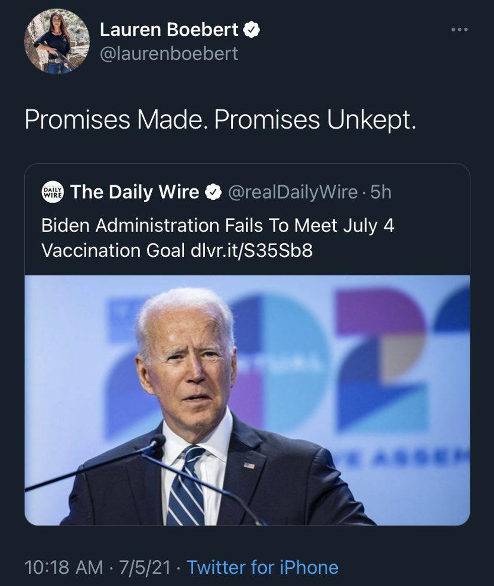 Colorado reached Biden's vaccination goal on Saturday, no thanks to Rep. Lauren Boebert, who chose to mock Biden's perceived failure rather than encourage her fellow Idiot Americans to get vaccinated.