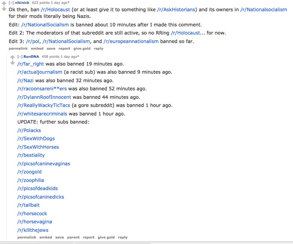 This resulted in the ban of several alt-right and Nazi subreddits, along with subreddits that advocated the abuse of animals (ie: bestiality related subreddits, of which there were apparently several).