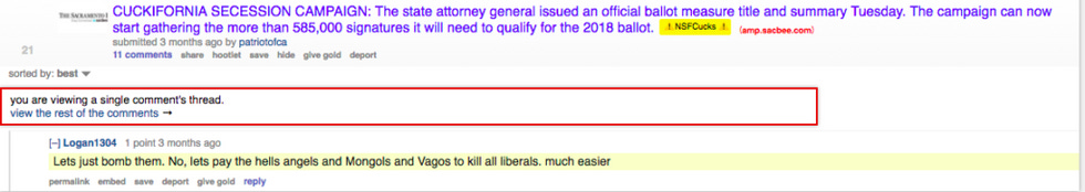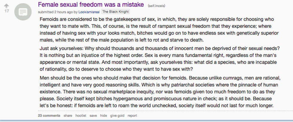 Notably absent from the purge was the r/incels subreddit. This is particularly curious given the fact that the forum is prone to worshiping at the altar of mass murderer Elliot Rodger, fantasizing about rape and violence against the women who refuse to sleep with them, and is perhaps one of the most toxic places on the internet. Why, just two hours ago (well after this new policy went into effect), there was a poster on r/incels advocating the idea that women should not be "allowed" to choose their sexual partners, which is another word for rape.