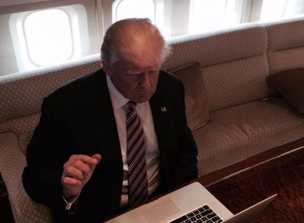 Nestled in the confines of his race and gender specific safe space, Trump spent about 45 minutes using his baby fingers to slowly type out about a dozen one and two sentence replies to some real tough, hard hitting questions.