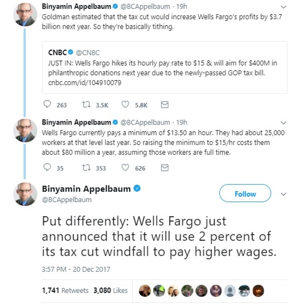 Hey, how about Wells Fargo's increased wages? Surely that's all thanks to the kind and wise tax cuts? Absolutely, as long as you assume Wells Fargo was seeing into the future when it planned the raises in September. And again, as NYT Washington correspondent Binyamin Appelbaum notes, the wage increase and the charitable donations don't amount to much, considering the waves of money soon to be lapping at the bankers' armpits: