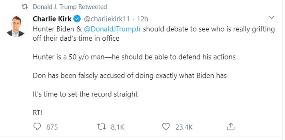 And you might think during times like these, it might be nice to have a president who doesn't retweet fuckfaced little wingnut baby Charlie Kirk SEVEN TIMES on a Monday morning, but that's just because you don't understand things like "governing."