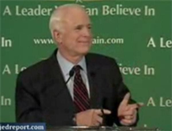 John McCain's speech last night -- the kickoff to his general election campaign -- was, simply, constipated. Whenever he tried to make one of his "zingers," he started giggling or, as the still to your left shows, he whipped out the ol' gun-slinger gesture to recognize his four supporters (1: 28 into the below clip). There was no Gravitas to his terrible lies this time, and everything was green, and he questioned the government's need to solve problems while speaking in New Orleans . Did "Cougs" Cindy slip him a percocet, or did old WALNUTS! just spend 10 minutes too long with his ether rag yesterday afternoon? Anyway, check out the comical highlight reel below, which ends with a crescendo of "Th-that's not ch-ange we can be-ee-lieve in."