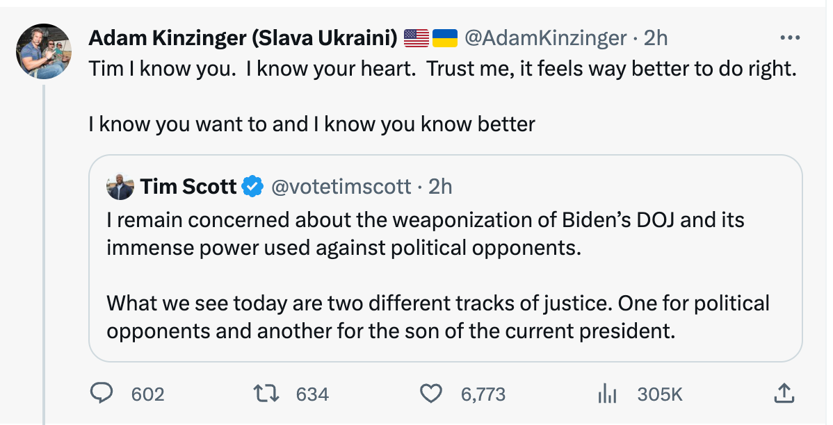 Sen. Tim Scott, who was on the other side of Trump’s mob on January 6, echoed the MAGA’s “weaponization of the DOJ” talking points.