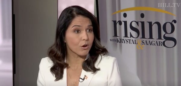 Tulsi Gabbard's giving up the House seat she would've lost anyway, so she's busy auditioning for a lucrative Fox Newsgig. Yesterday, Gabbard went on "Rising" withThe Hill 's Krystal Ball and Saagar Enjeti. The supposedly Democratic candidate for president was served up an anti-impeachment, anti-Nancy Pelosi amuse-bouche and she eagerly gobbled it up.